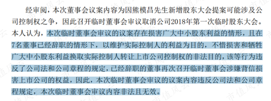 看到辞职后又撤销的“骚”操作,时任董事的熊模昌表示反对,认为这个议案损害了广大中小股东利益,审议内容非法且无效。