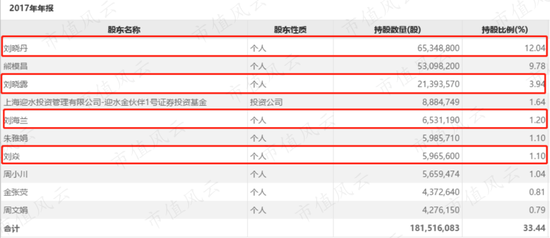 截止2017年末,刘氏家族掌握公司大权,刘焱女士、刘晓丹(刘焱之女)、刘晓露(刘焱之子)和刘海兰(刘焱儿媳)4人合计持有公司18.29%股权。