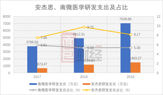 安杰思过去几年保持了较为稳定的研发投入,2017年、2018年、2019年研发投入占营业收入的比例分别为7.46%、9.75%和8.17%。相比于主营业务同为微创诊疗器械的另一家科创板上市公司南微医学,安杰思的研发支出金额明显较低,但研发投入占比高于对方。