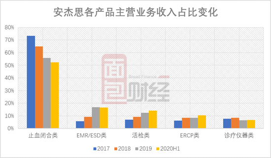 拉长时间来看,安杰思止血闭合类产品2017年至2020年上半年的营收占比则呈下降趋势。与之相对应的是,EMR/ESD类、活检类、ERCP类产品的主营业务收入占比持续上升。