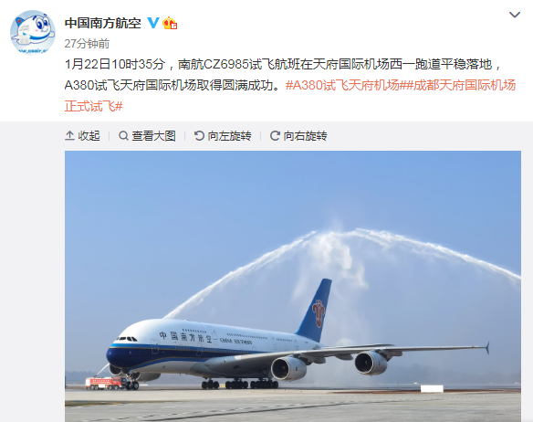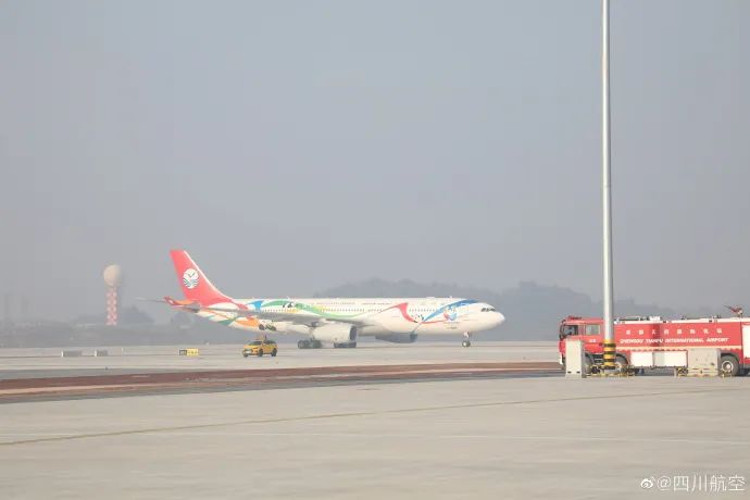 22日上午10时10分,承载着“十全十美”美好祝愿的四川航空A330“成都大运号”率先降落在天府国际机场西一跑道上,随后中国国际航空B747-8、东方航空B777-300ER、祥鹏航空B737-800、成都航空ARJ21、南方航空A380-800以5分钟为间隔,相继在天府国际机场西一跑道上平稳落地。