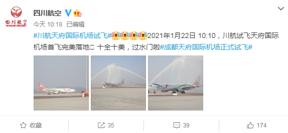 1月22日,成都天府国际机场迎来真机试飞。6架飞机从成都双流国际机场依次起飞,抵达成都天府国际机场后,接受“过水门”仪式。
