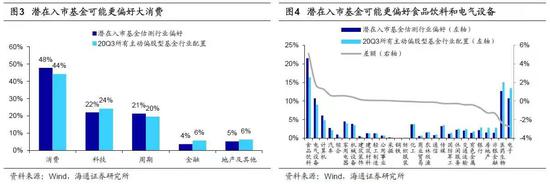 海通策略以2020Q3全部主动偏股型基金的持股偏好为基准,分析潜在入市基金的持股偏好,从大类行业来看,潜在入市基金相对全市场的主动偏股型基金会更加偏好大消费类行业。具体到申万一级行业,潜在入市资金可能较全市场的基金明显超配食品饮料、电气设备和计算机,两者在食品饮料上的配置力度为22%/17%,电气设备上为11%/9%,计算机为6%/5%;明显低配电子和医药,两者在电子上的配置力度为11%/14%,医药上为13%/15%。