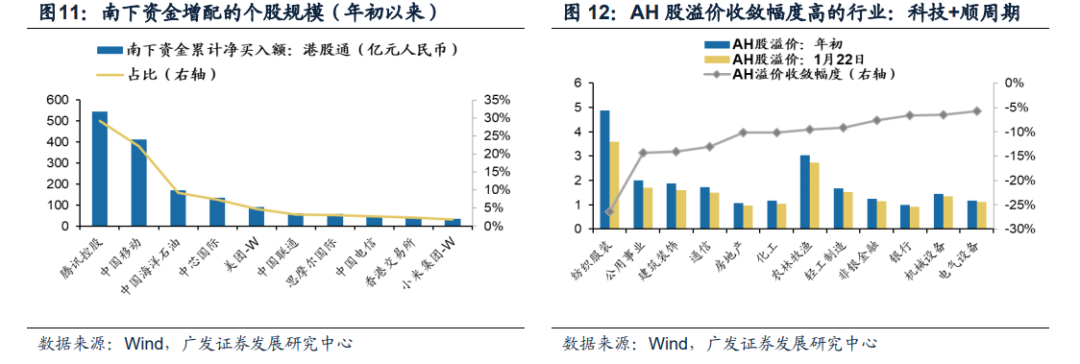 趋势上:业绩预期上修、海外风险下修、人民币升值预期以及AH高溢价共振,港股新一轮牛市启动。结构上:南下资金集中持仓港股优质资产(腾讯控股/中国移动/中海油/中芯国际/美团5家公司的南下资金合计流入额占比超过70%)。南下资金持续流入带来AH指数溢价收敛,近期AH溢价收敛的行业主要集中在具备产业趋势的科技+盈利预期修复的顺周期(建筑、地产、化工、轻工、金融、机械)。