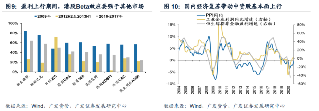 (四)港股:南下资金“二八分化”但市场行情扩散方向已现端倪:科技+顺周期。趋势上:业绩预期上修、 海外风险下修、人民币升值预期以及AH高溢价共振,港股新一轮牛市启动——(1)20Q4盈利上修:20年国内经济 修复带动港股中资股盈利从四季度开始触底并进入回升周期。经验数据显示,在盈利回升周期,港股市场的Beta要大于其他市场。(2)海外风险下修:港股对海外风险较为敏感。随着疫苗落地、拜登顺利交接、民主党控制国会,全球政策不确定性指数持续回调。(3)当前中美利差仍处于历史最高点附近,人民币仍有较强升值预期,外资更加倾向于买入中资港股资产。(4)截止本周末收盘,恒生AH溢价指数仍高达134.8%,将继续驱动南下资金买入港股 优质资产。结构上:南下资金集中持仓港股优质资产,但在科技+顺周期等领域,行情广度也在扩散——年初以来南下资金累计净流入超1800亿元,不过主要集中在部分优质标的:腾讯控股/中国移动/中海油/中芯国际/美团总共5家公司的南下资金合计流入额占比超过70%。南下资金持续流入带来AH指数溢价收敛,近期AH溢价收敛的行业主要集中在具备产业趋势的科技+盈利预期修复的顺周期(建筑、地产、化工、轻工、金融、机械)。