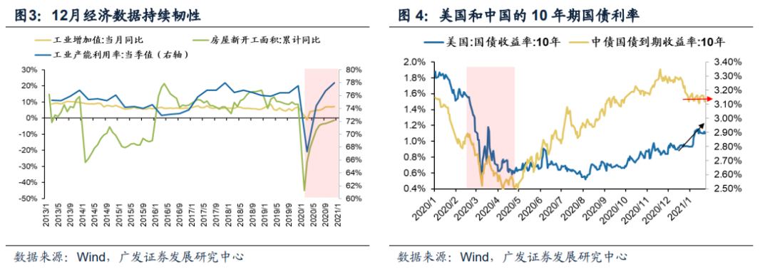(二)疫苗落地强化经济修复“确定性”,疫情反复助力顺周期“涨价”逻辑。本周公布的12月经济数据继续改善——12月产能利用率已经修复到疫情前的水平;工业增加值同比增长为7.3%,创年内新高;制造业增加值增速基本持平;四季度GDP同比增速为6.5%,略高于预期。疫苗落地有助于弱化疫情反复导致的经济前景“不确定性”——去年末以来全球/中国疫情反复,但经济增长预期并不差:美国10年期国债收益率持续回升(反映经济修复再通胀预期),而中国的10年期国债收益率近期也基本横盘震荡(没有明显回落)。本周中国疫情反复,一定程度上会约束企业供给,加大“供需缺口”,助力顺周期“涨价”行情——我们在1.18《产能视角看行业“供需缺口”》中指出:16年“实体供给侧改革”以及18年“供给收缩常态化”以来,企业的产能利用率持续高位;另一方面,顺周期行业产能的投放相对滞后,这会造成部分行业结构性的“供需缺口”。