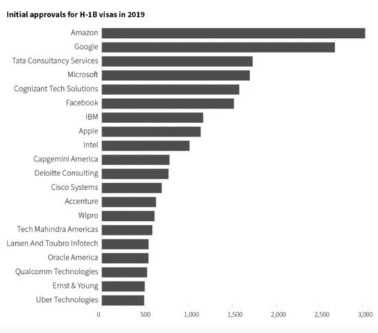 而在申请H-1B签证最多的10家企业当中,有7家都是全球领跑的科技公司,包括亚马逊、微软、脸书、谷歌、苹果、IBM等。