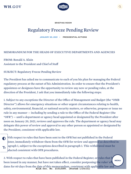 翻译下这个“即将采取的政府行动”。其中有一部分就是上届美国政府已经确定,但还没开始生效的法规。