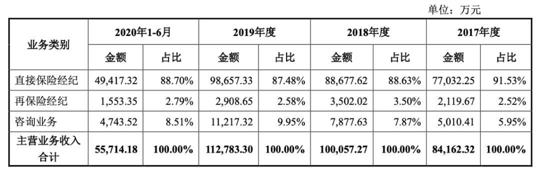 如,2020年上半年,5.57亿元的营收中,直接保险经纪、再保险经纪、咨询业务分别占比88.70%、2.79%、8.51%。2019年,直接保险经纪对营收的贡献为87.48%,再保险经纪、咨询业务分别占比2.58%、9.95%。2017年、2018年,直接保险经纪则分别贡献了当年度营收的91.53%、88.63%。