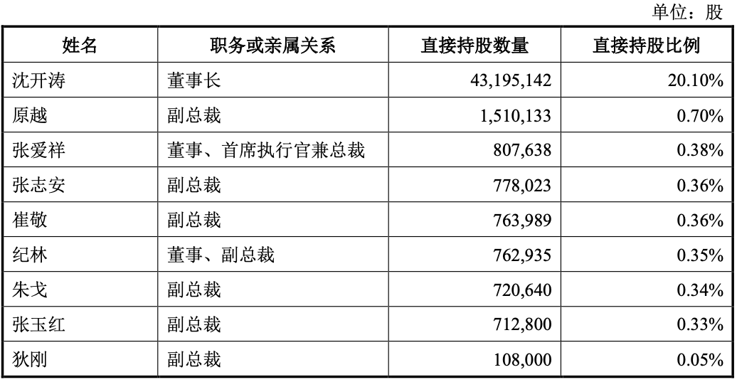 截至招股书签署日,江泰保险的多位高管及其近亲属直接或间接持有公司股份。直接持股的共有9人,除公司董事长沈开涛外,还有8位高管。具体如下: