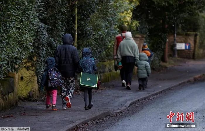 1月5日消息,英国疫情严峻,学生上学依旧。图为新冠肺炎爆发期间,学生们在新学期的第一天步行上学。