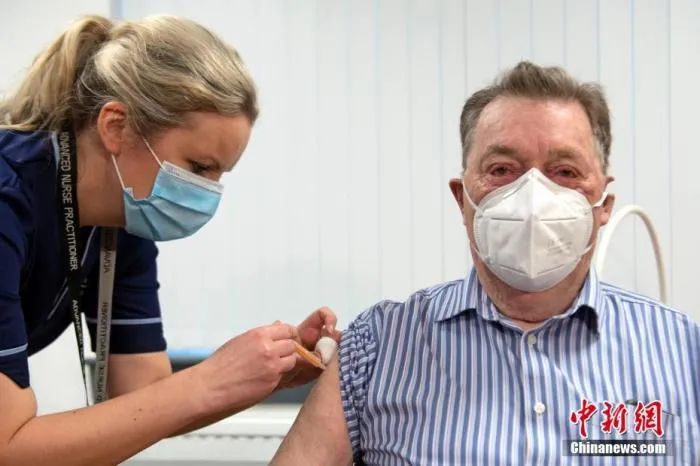 1月4日,在英国苏格兰邓迪的洛基健康中心,护士为一名82岁的老人注射新冠疫苗。