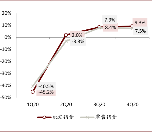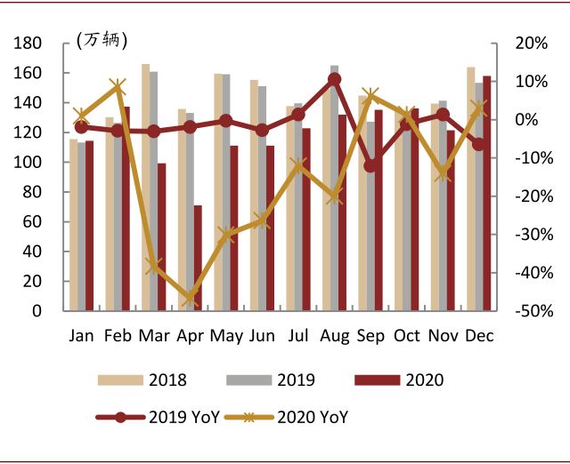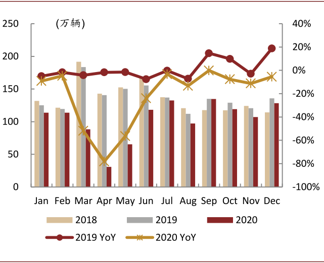 经历2018-2019年连续下滑以及2020年疫情影响,我们认为乘用车需求处于3年下滑的尾端,去年3-4季度国内乘用车批零销量持续实现+7%以上的同比正增长,环比趋势走强,同时月销量持续稳定在2018年的同期水平以上,体现出疫情并未对居民收入预期和购车决策产生较大的负面影响,更为对去年1-2季度产销的一次性冲击。