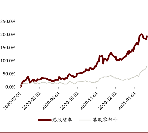此轮上涨以整车及大市值个股为主,小市值零部件标的相对滞涨。从2020年7月开始,由长城A/H拉开了整车板块上涨的序幕,后续伴随车企2-3季度的业绩回暖,以及3季度行业销量的逐步走强,10月开始整车板块股价整体走势强劲,A股SW汽车整车指数自去年7月至今涨幅接近100%,主要体现为估值提升,板块平均TTM P/E从30倍左右提升至40倍以上,港股也有类似表现;相比之下,零部件板块整体涨幅比较有限,SW零部件指数涨幅为33%,板块平均TTM P/E基本保持在30倍左右。