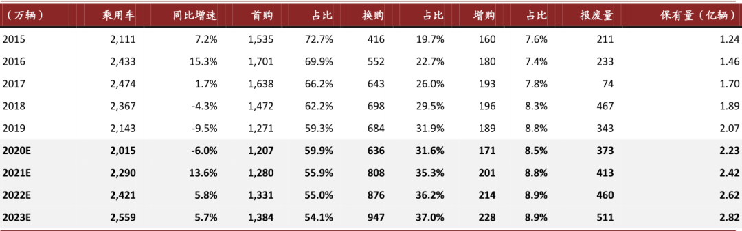 我们预计在2020年低基数的背景下,2021年国内乘用车有望实现14%左右的高增长。具体来看,增长驱动力包括:1)首次购车需求占比仍高,低线城市保有量仍低,2015-2017年购置税减半透支效应减退,首次购车的刚性需求释放;2)经济活动恢复,换购需求带动的更新周期回归常态。