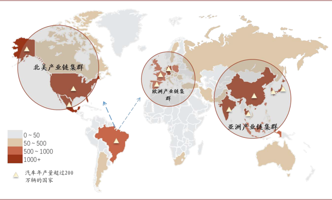 主机厂为核心辐射周边,全球已形成三个主要的产业链集群。全球零部件厂商目前主要分为三个集群:以美国为核心的北美产业链集群,以德国为核心的欧洲产业链集群,以中、日、韩为多核心的亚洲产业链集群,南美地区受益于发达的、价格低廉的海运,弥补了其远离核心整车生产商的地缘劣势,为本地、北美、欧洲等地的整车厂供货。