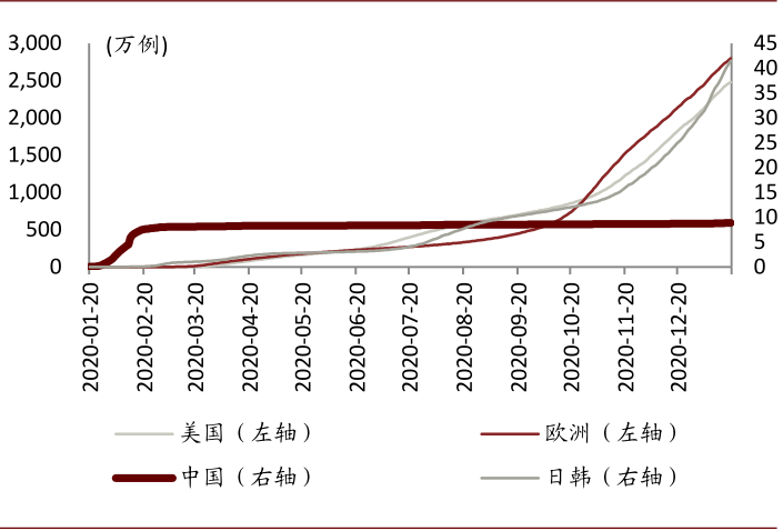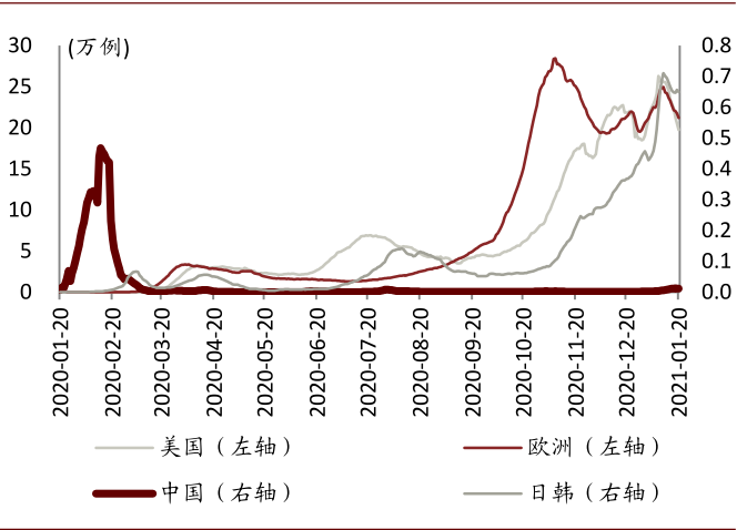 海外疫情波动反复,欧美、日韩地区尤为严重。进入去年4季度,海外新冠肺炎疫情出现反复,截至2021年1月19日,美国、欧洲累计确诊病例数分别达到2,481万和2,798万,日新增确诊病例数仍处于高位,近期均在17万例以上。相比之下,中国疫情已经得到有效控制,自2020年3月以后,累计确诊病例数量未有明显增加。