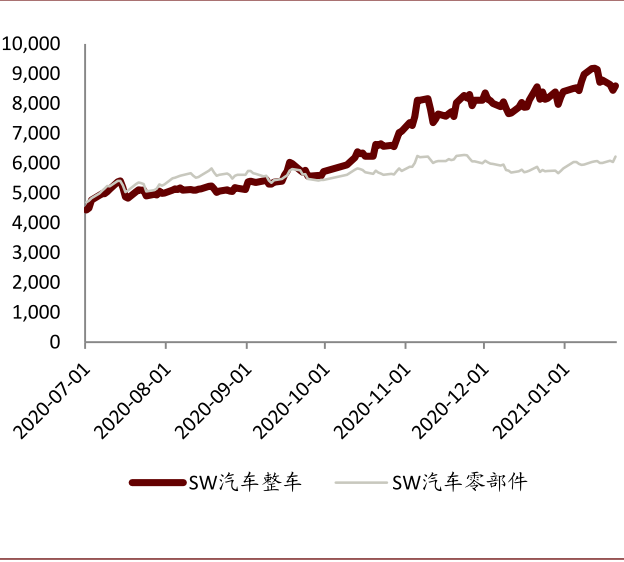 图表: A股整车与零部件指数走势(2020年7月至今)