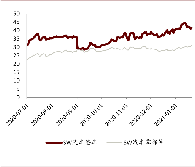 图表:A股整车与零部件企业TTM P/E走势(2020年7月至今)