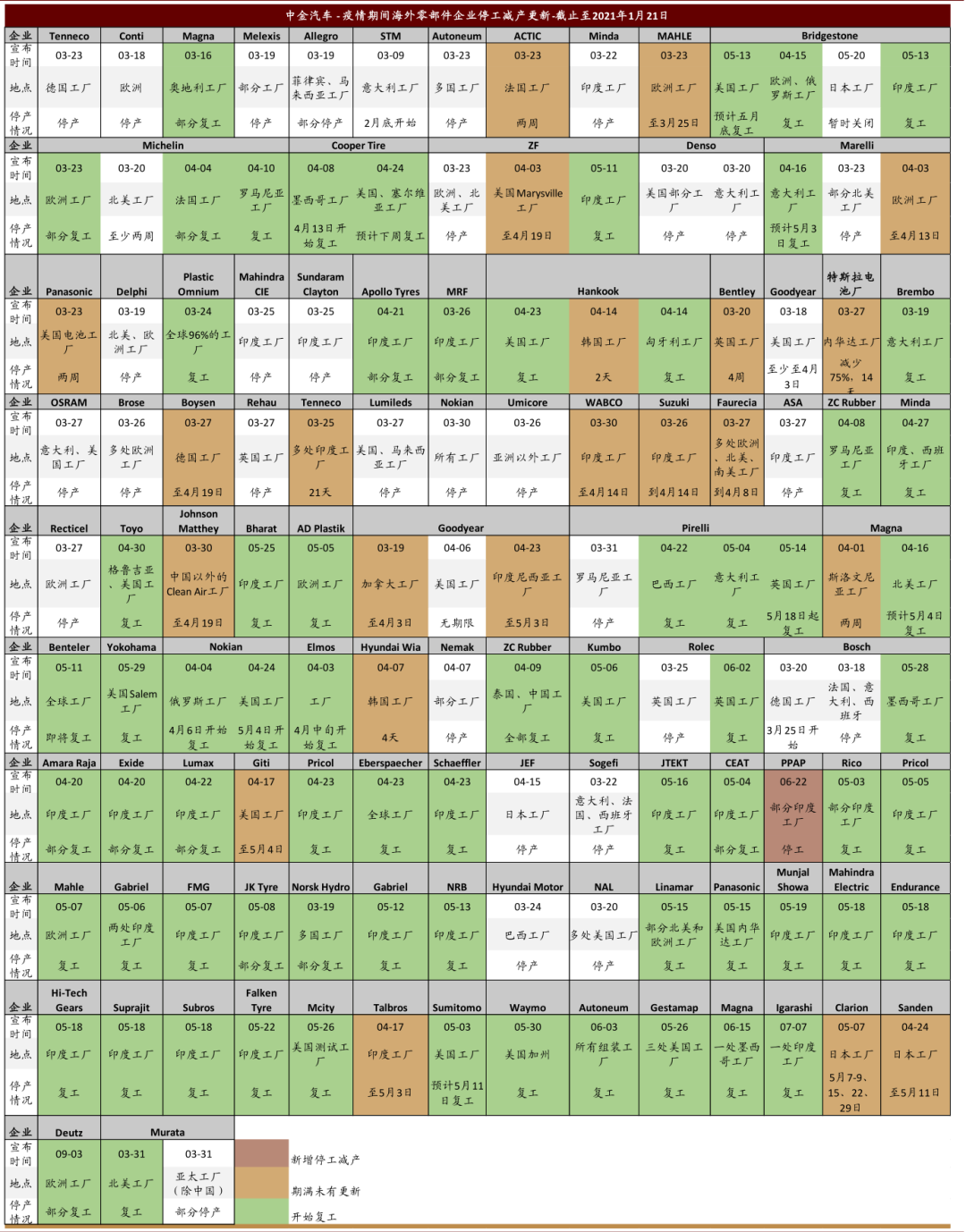 图表: 海外零部件企业停减产情况(截至2021年1月21日)