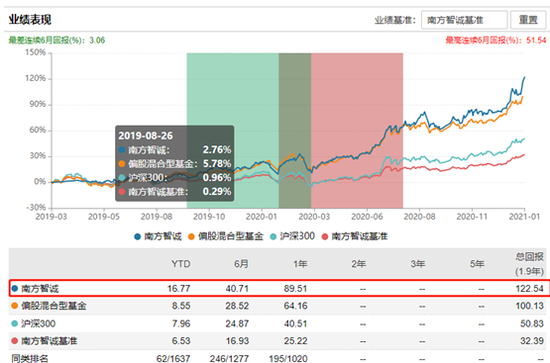 WIND数据显示,截止2021年1月25日,南方智诚总回报122.54%,跑赢偏股混合型基金、跑赢沪深300指数,跑赢南方智诚基准。截止2020年12月31日,基金规模9.46亿元。