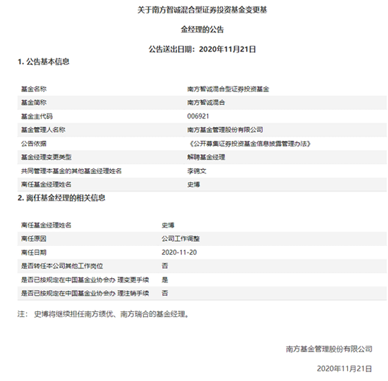 2020年11月21日,南方智诚混合型证券投资基金发布变更基金经理的公告,史博因公司工作调整离任该产品基金经理,离任日期为2020年11月20日。