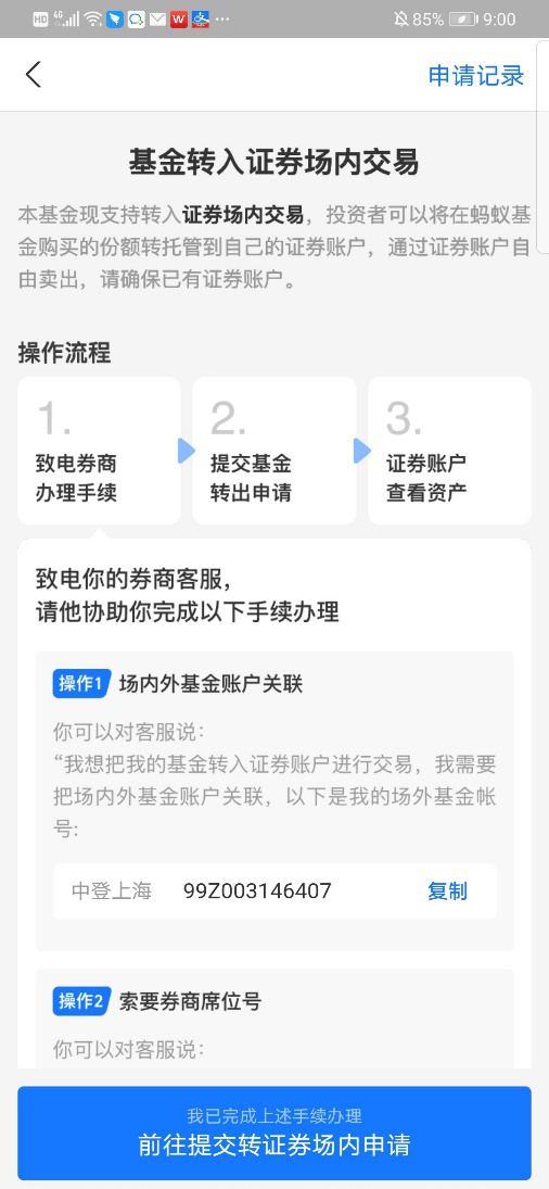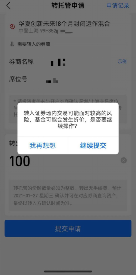 2、输入券商名称和席位号(可致电您开户的券商查询席位号),填写要转出的份额