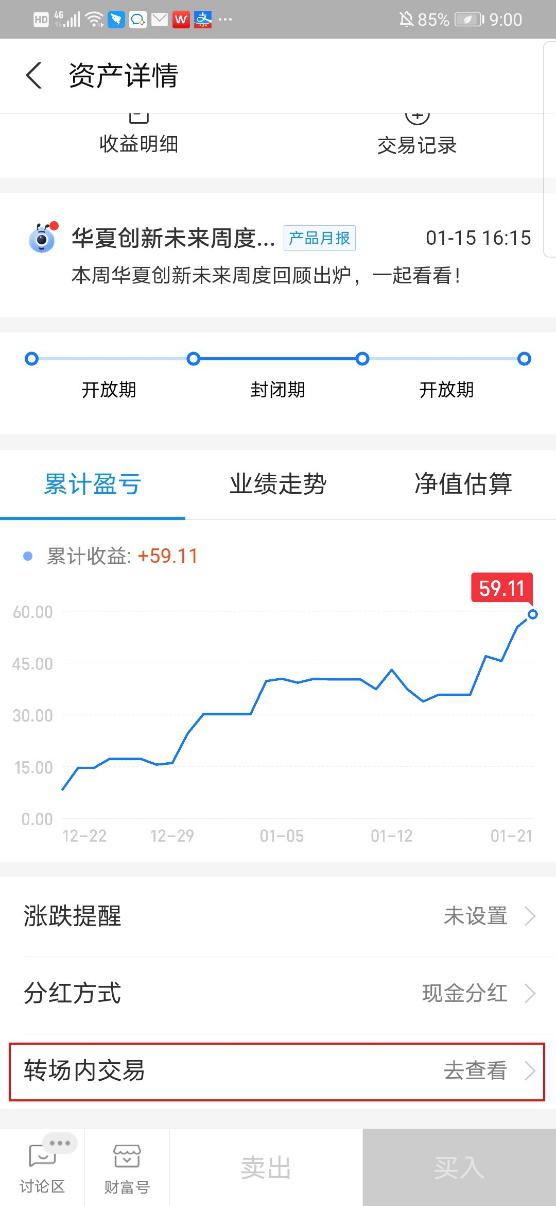 支付宝App-我的-总资产-基金-持有-选择对应的创新未来基金点击进入资产详情页-往下滑-转场内交易-去查看