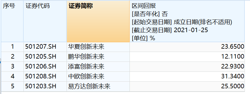 Wind数据显示,截至1月25日, 5只创新未来基金自成立以来取得不俗的表现。中欧创新未来收益率超30%,达到31.34%;易方达创新未来、华夏创新未来和汇添富创新未来收益率超20%,分别达25.50%、23.65%和22.93%;鹏华创新未来收益率为12.11%。