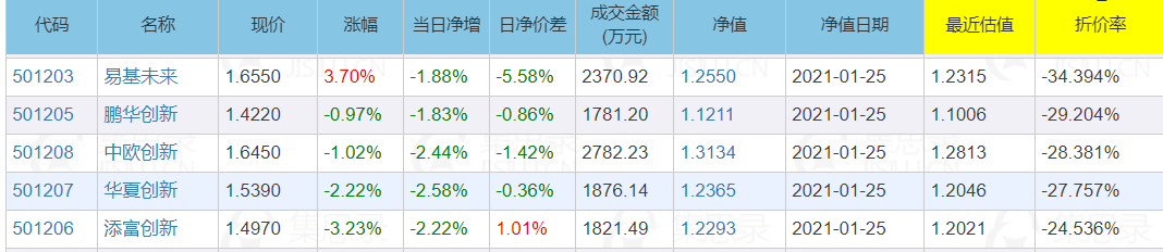 1月26日,5只创新未来基金发布溢价风险提示及临时停牌公告称,为保护投资者利益,将于2021年1月26日9:30至10:30临时停牌,自2021年1月26日10:30 复牌。复牌后,5只创新未来基金呈上涨态势,10:50左右画风突变,5只基金集体翻绿,大跌5个点,随后又再度翻红。