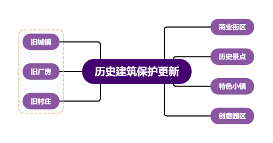 对于留有历史建筑物的旧城镇、厂房以及村庄等,优先考虑保留历史城区的传统风貌与建筑环境,保护真实历史遗存。所以可以将历史建筑保护更新后项目分为历史景点、商业街区、特色小镇以及创意园区。而历史建筑保护涉及改造差异较大,无法逐一而论,所以在此不赘述城市更新中“留”项目涉及产业链。