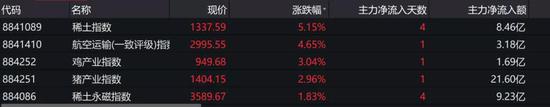 概念板块中,大飞机、航母、CRO、十大军工集团等概念板块领跌市场,稀土、航空运输、鸡产业、猪产业、稀土永磁等概念板块实现上涨。从概念板块资金流向看,稀土板块获得资金持续流入时间最长,而猪产业今日获得资金流入最多。