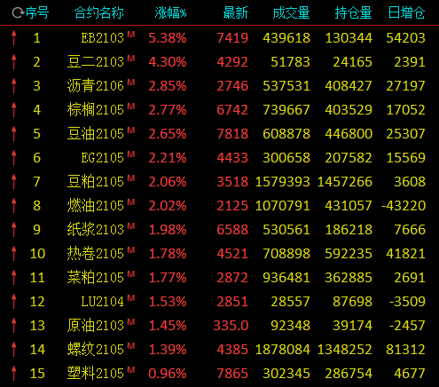 热点栏目1月27日,国内期市收盘涨多跌少,苯乙烯大涨逾5%,沥青涨近3%,乙二醇、燃油涨逾2%,纸浆涨近2%;农产品飘红,豆二涨逾4%,棕榈油、豆油涨近3%,豆粕涨逾2%;跌幅方面,沪锌跌逾2%。