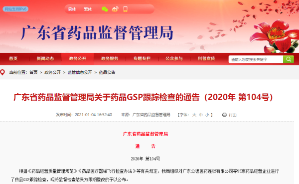 此外,2021年1月4日,广东省药监局发布的“关于药品GSP跟踪检查的通告(2020年第104号)”显示,95家企业需要限期整改,其中,广东壹号大药房位列整改榜单。