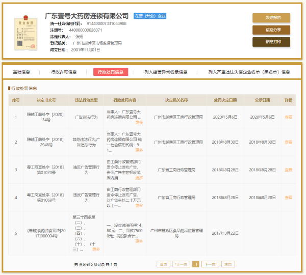 值得注意的是,据国家企业信用信息公示系统显示,近年来,广东壹号大药房多次因广告违规被处罚。