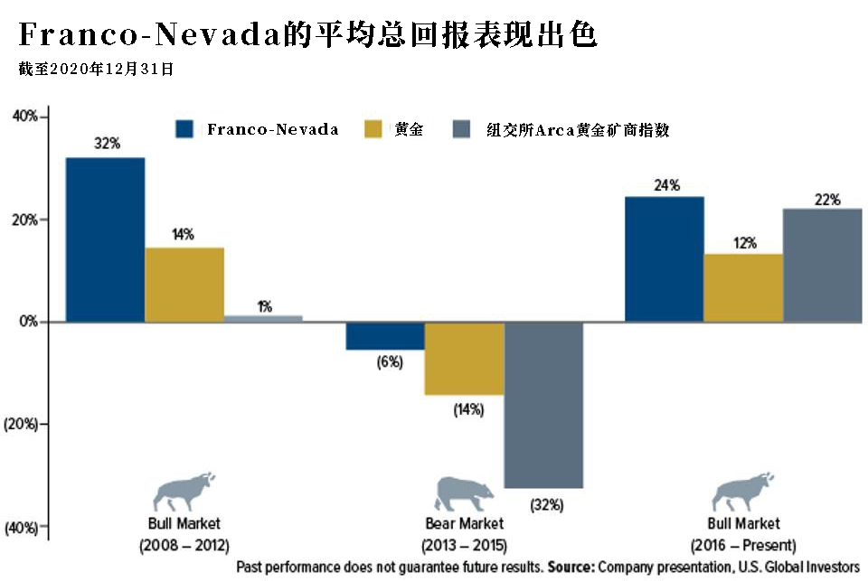 除了已经提到的证券外,黄金和贵金属矿商的表现也值得关注。Franco-Nevada和惠顿贵金属(Wheaton Precious Metals),在牛市和熊市中都曾多次表现优异。无论在资产价格上涨或下跌的时期,Franco的收益均大大超过了实物黄金和大盘指数。