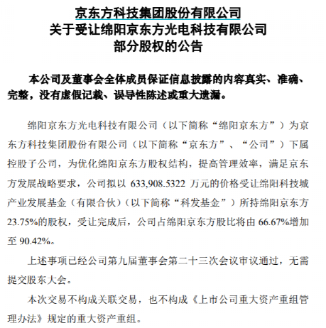 200亿元巨额定增刚抛出不到半个月时间,昨晚京东方A再提新收购,拟以63.4亿元受让绵阳京东方23.75%股权。