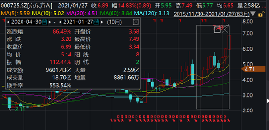 不过显然,在200亿“天量定增”之后,这次60亿的新收购就显得“小巫见大巫”,并没有在市场上砸出太大水花。1月27日早盘,京东方A呈“深V”走势,截至午间收盘,收涨1.92%,报6.89元/股,最新总市值为2366亿元。