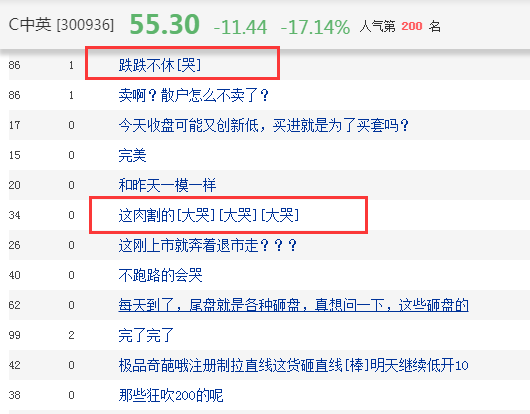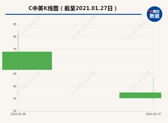 C中英上市第一天,按当天74.34元的成交均价计算,意味着每中一签的盈利金额为21975元,所对应的收益率为144.62%。盘中最高报82.58元。按照今天的收盘价55.3计算,短短两天的时间内股价距最高点已经下跌33%,市值蒸发20.5亿元。