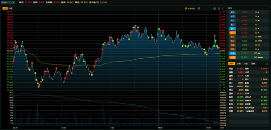 国债期货全线上涨。十年期主力合约涨0.01%;五年期主力合约涨0.06%;二年期主力合约涨0.01%。沪指探底回升,收于3573.34,涨0.11%。剩余期限9.73Y 20国开15 收益率全天震荡,最高成交在3.5775%,最低成交在3.55%,实时行情3.555%,与昨收持平。今日成交870笔(昨日成交1159笔)。