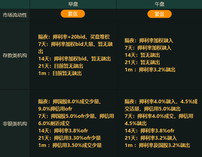 今日市场流动性紧张。午后非银类机构隔夜资金押利率4.0%融入,4.5%成交适量,押信用5.0%融出;NCD方面,1M期限国股TRD在 3.05%;一级方面,1Y期限国股发行在 3.02%。