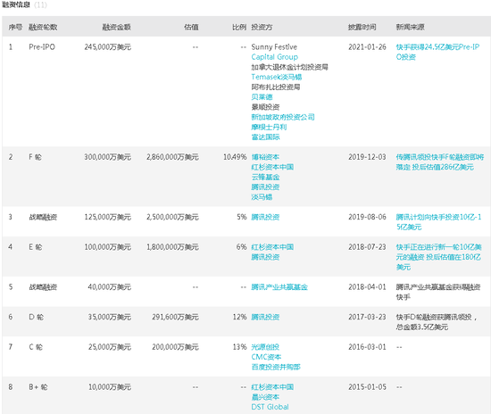 据Wind全球企业库数据,截至2021年1月26日,快手共经历了11轮融资,其中天使轮由晨星创投投资,融资金额为30万美元,最新一轮Pre-IPO轮由Sunny Festive、加拿大退休金计划投资局、贝莱德、景顺投资等投资,该轮融资金额为24.5亿美元。