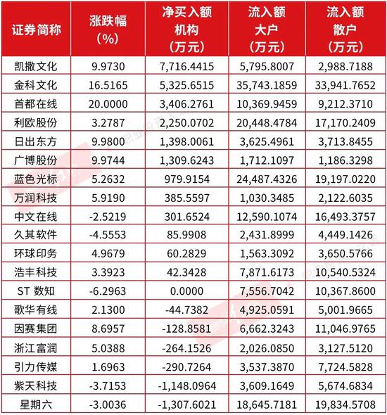 相较之下,散户净流入额前三名的公司为金科文化、星期六、蓝色光标,净流入额分别为33942万元、19835万元、19197万元。