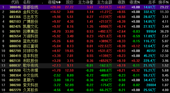 而大户净流入额前三名公司则为金科文化、蓝色光标、利欧股份,净流入额分别为35743万元、24487万元、20448万元。