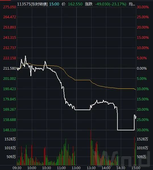 此外溢利转债、康隆转债等10只仅小幅反弹,仍下跌超过10%。而东时转债小幅回升后再度直线下跌达30%,触及二次熔断,最终尾盘一分钟有所回升,全天以大幅下挫23.17%收盘。
