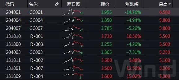 交易所国债逆回购,多数品种年化利率也纷纷走高。Wind行情显示,1月27日,1天、2天、3天、4天和7天等短期品种国债逆回购均出现大幅上涨,盘中纷纷突破年化利率5%。其中上交所1天期(GC001)一度达到6.5%,再创1个多月新高。并且前一个交易日其已经大涨,盘中年化利率最高已经突破6%,可见市场利率快速上涨。