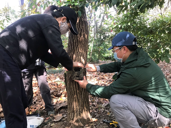 复旦大学团队招募的志愿者在上海顾村公园安装红外相机。复旦大学团队供图