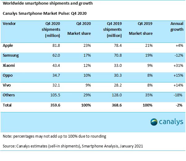 近日,多家数据机构公布了2020年第四季度全球智能手机市场情况。