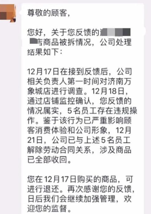 12月24日凌晨,泡泡玛特官方回复该网友,此事为5名店员自行拆开11个盲盒,拿走了想要的以后才结账,并已经辞退全部涉事员工且永不录用。