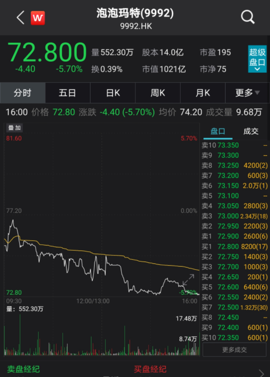 今天下午,该股进一步走跌,截至港股今日收盘,泡泡玛特股价报收于72.8港元,跌幅达5.7%,目前总市值约1020.61亿港元,较前一交易日收盘蒸发超60亿港元。而较1月26日收盘,该股股价下跌10.12%,两个交易日市值蒸发114.96亿港元。